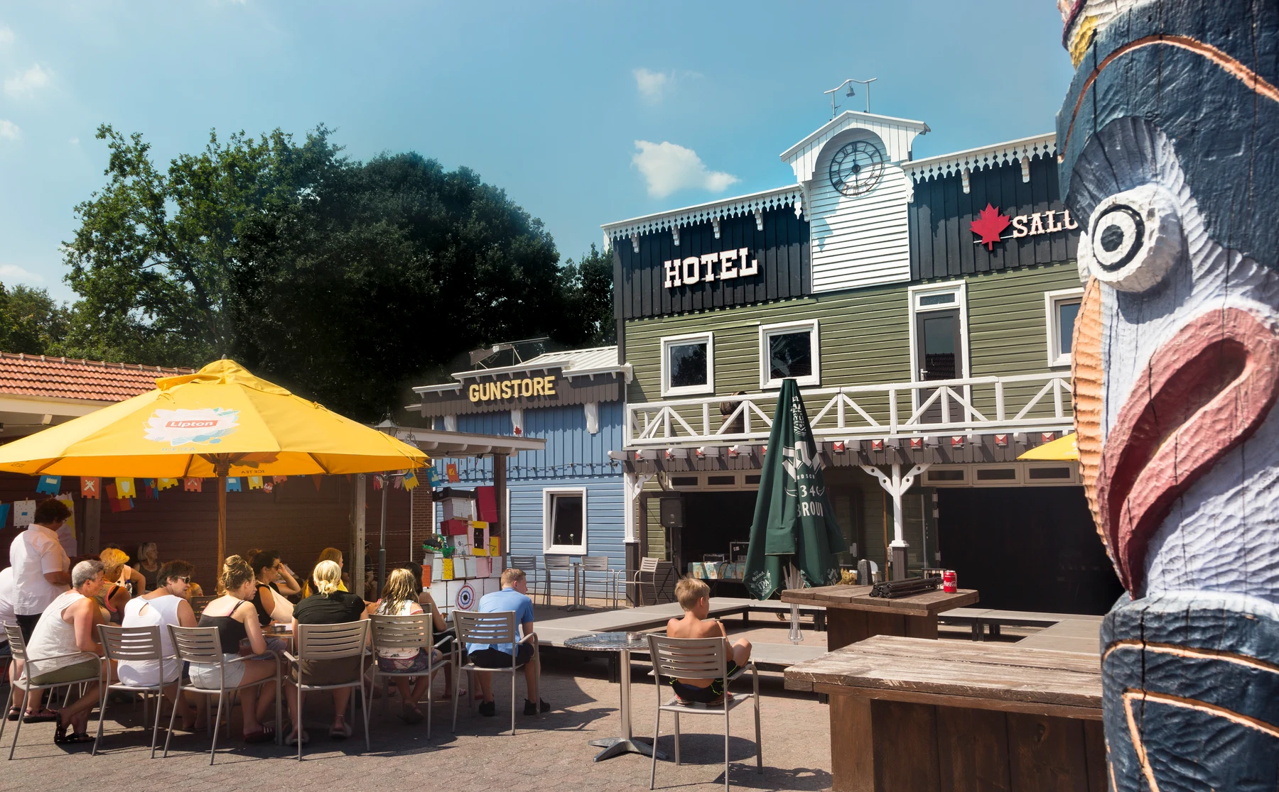 If you're in for some action, we'll see you on the sports field for football, a game of beach, basketball or tennis. The children can climb, play and jump in several playgrounds or on the air trampoline. If you prefer to relax along the water's edge, you can cast a fishing rod for free in the fishing and rowing pond. During the holidays, nothing and everything is allowed, so gather around the totem pole on the central square at the end of the day to enjoy a bite to eat at the Grand Café Ontario or a nice fry or ice cream at the Quebec cafeteria.